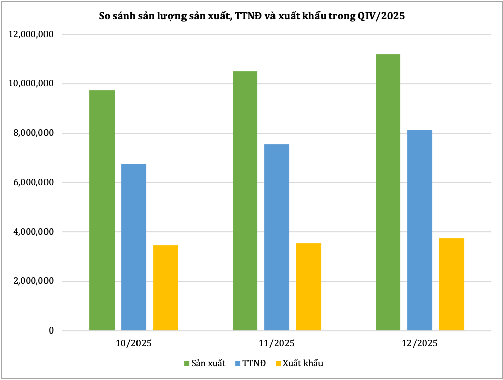 • Tiêu thụ nội địa đạt trên 22 triệu tấn, tăng khoảng 25% so với quý III, nhờ cao điểm mùa xây dựng và tiến độ giải ngân đầu tư công được đẩy nhanh.