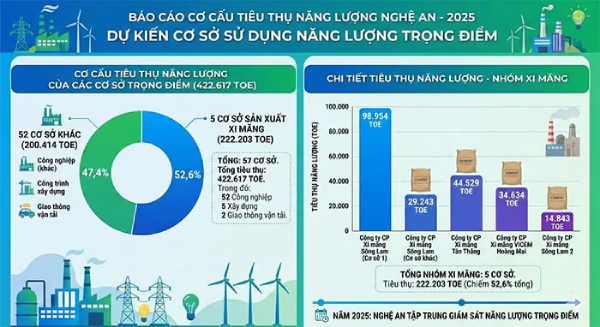 Tổng mức tiêu thụ năng lượng của 5 cơ sở xi măng đạt khoảng 222.203 TOE, chiếm 52,6% tổng tiêu thụ của các cơ sở trọng điểm toàn tỉnh. Trong đó, Xi măng Sông Lam có mức tiêu thụ cao nhất (khoảng 98.954 TOE và 29.243 TOE tại 2 cơ sở), tiếp đến là Xi măng Tân Thắng (44.529 TOE), VICEM Hoàng Mai (34.634 TOE) và Sông Lam 2 (14.843 TOE).