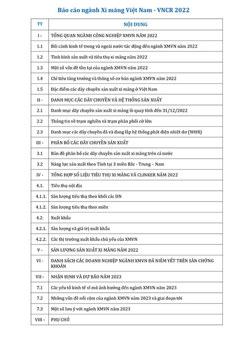 Với kết cấu gồm 8 phần chính, ấn phẩm Báo cáo ngành Xi măng 2022 sẽ cung cấp cho độc giả những số liệu tổng hợp nhất về ngành Xi măng Việt Nam trong năm 2022, bao gồm: Các số liệu tổng quan về ngành như: năng lực sản xuất theo thiết kế, năng lực sản xuất theo thực tế; danh sách các dây chuyền sản xuất xi măng (lò quay) tính đến hết năm 2022... Đồng thời cập nhật chính xác và đầy đủ các số liệu về tình hình sản xuất, tiêu thụ nội địa và xuất khẩu xi măng, clinker trong năm 2022 chi tiết theo từng tháng và từng vùng miền. Ngoài ra, trong ấn phẩm báo cáo này cũng cập nhật đầy đủ danh sách và những thông tin cơ bản nhất về các doanh nghiệp trong ngành đã niêm yết trên các sàn chứng khoán...
