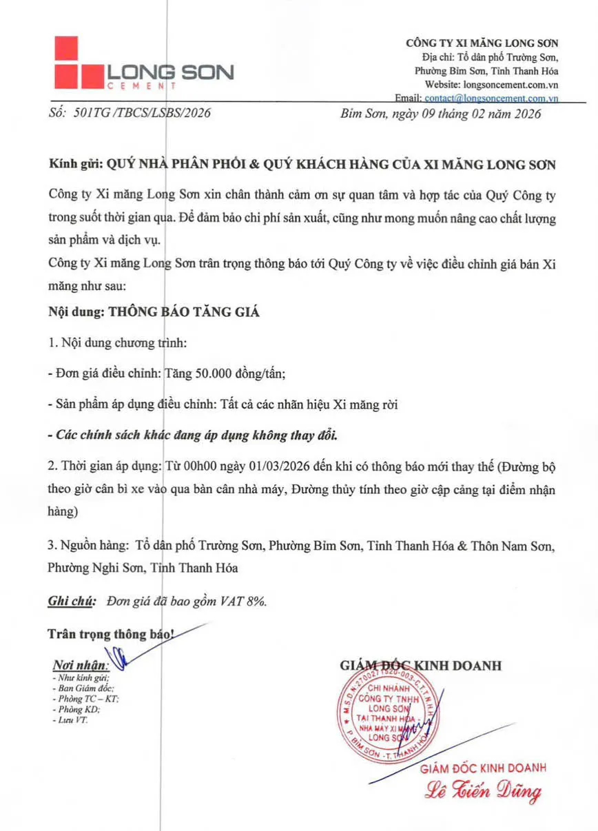 • Thông báo điều chỉnh tăng giá bán xi măng rời xi măng Long Sơn